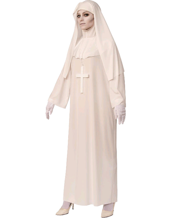 Dress as a nun this Halloween with our White Nun Womens Costume. The costume features a white robe and a matching white veil with a collar! The costume also includes a white plastic cross. Just add white stocks and white shoes to complete the costume!