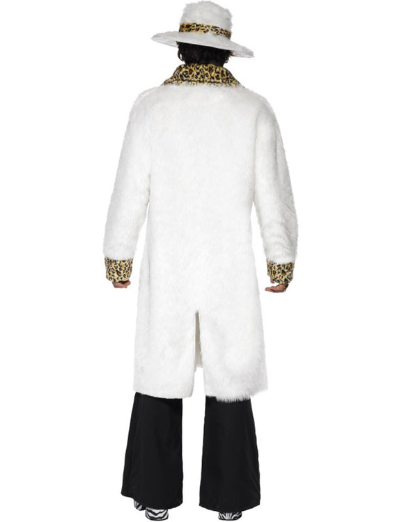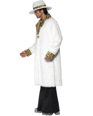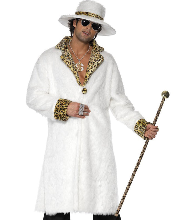 Act the big shot in this White Pimp Coat Mens Costume with its faux fur and leopard trimmed coat matching hat and black flares you''ll be sure to attract all the right attention! Pimp it up with some bling and a stick (sold separately).