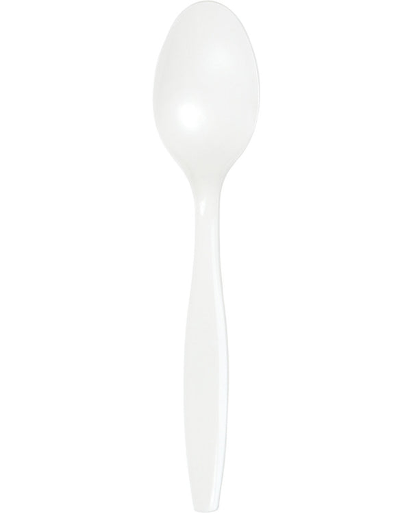 Complete the table servingware for your party or event with this White Premium Spoons Pack of 24. This pack includes 24 spoons in a crisp white colour. Match with other products from our white party supplies range for a coordinated look!