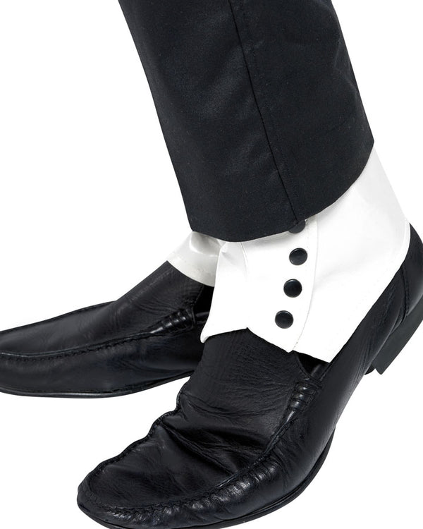 These White Spats with Black Studs are the perfect finishing touch to any vintage costume, whether you're a 1920s gangster, a 1940s mobster or you just want to look a bit spiffy for the party. These spats are white with black button detail and close with velcro at the back. They also have a piece of elastic which goes underneath your shoe to keep them in place.
