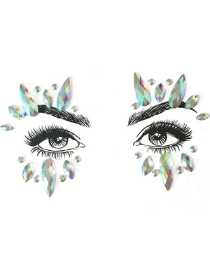 Give yourself a crystalline look for your next festival or party with this set of White Witch Face Jewels! These gemstones are attached to a clear film that you simply arrange around your eyes for maximum statement and ultimate sparkle. Simply attach with a skin friendly glue like spirit gum or eyelash glue and shine the night away. As an added bonus, these are completely reusable! So you can change up your look again and again.