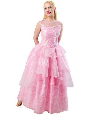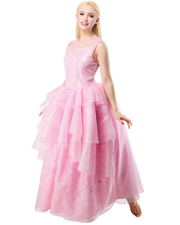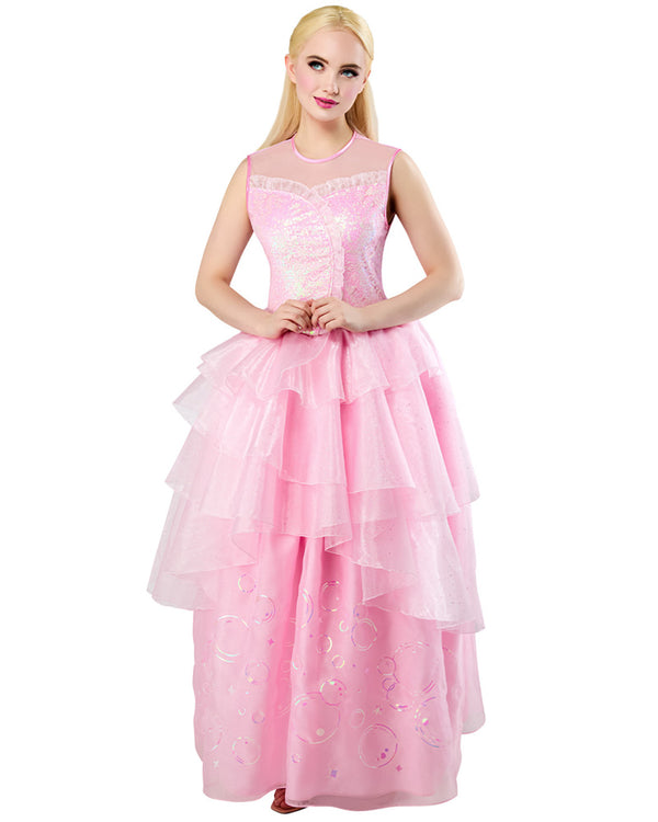 Transform into the enchanting beauty from the Land of Oz with this Wicked Glinda Deluxe Womens Costume. A stunningly detailed design inspired by the 2024 film, Wicked, starring Ariana Grande as Glinda, this dreamy pink dress features a beautiful waterfall-layered glitter tulle skirt with iridescent bubble prints, flowing over a satin under-skirt. The shimmering pink bodice sparkles with tulle ruffle accents, while the pink mesh neckline adds an extra touch of elegance. Now all you need is your magical wand and your bestie, Elphaba, and you’ll be ready to sing and dance to all the hits at your next Wicked or movie themed party.
