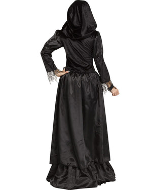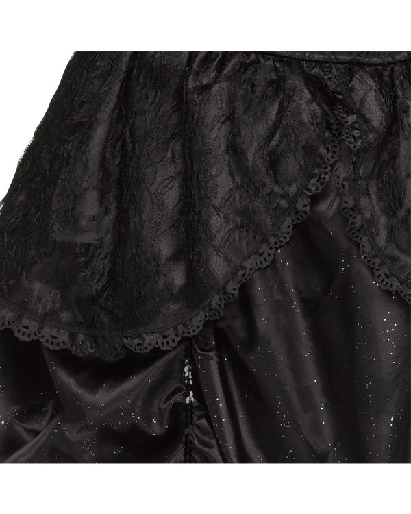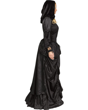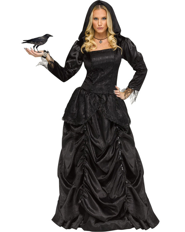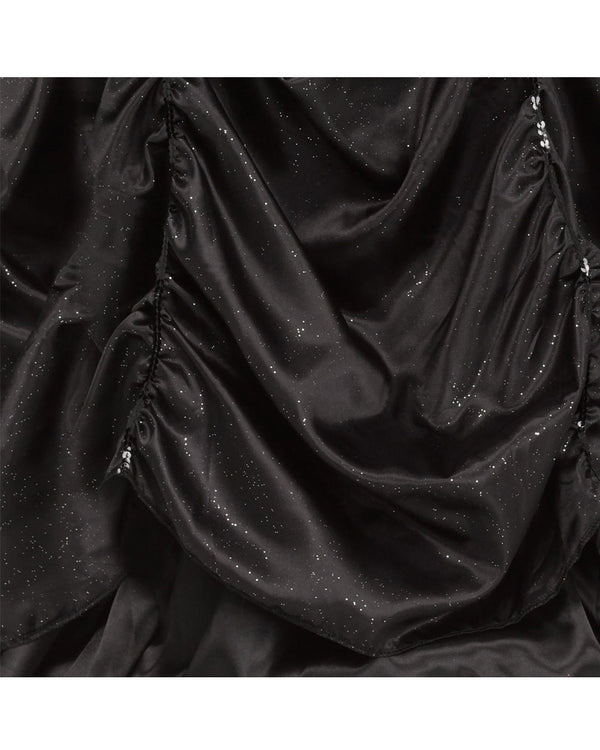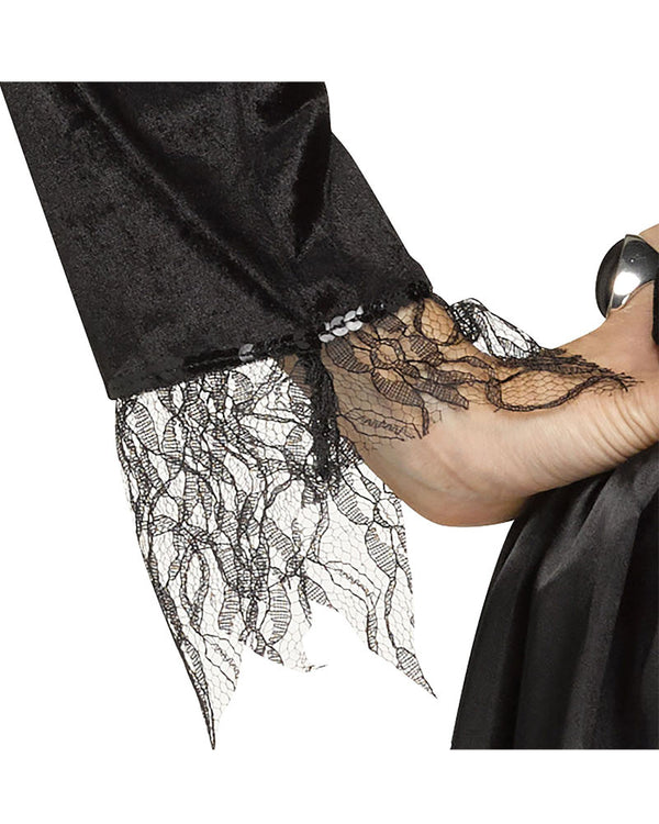 Become a queen who rules the night wearing this elegant Wicked Queen Womens Costume. This gothic gown comes in midnight black with a black glitter satin-like ruched skirt. The bodice comes with a square neckline with attached long sleeves with black lace at the cuffs. There are black lace peplum skirts draped over the main skirt. Attached around the back is an attached velvet black hood.