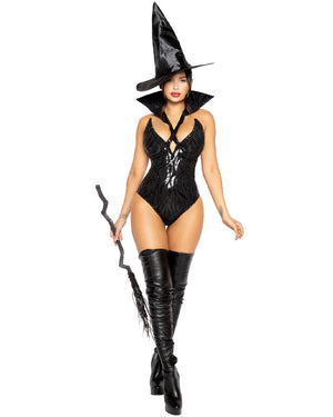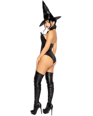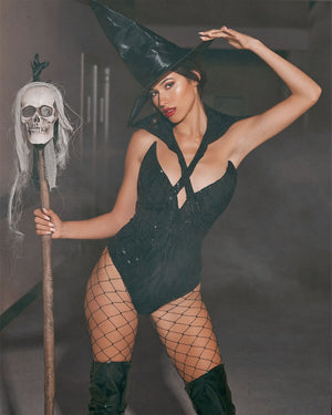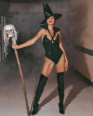 This Wicked Witch Womens Costume is sure to make jaws drop at any magical event you have planned, from Halloween to a Saturday night at home. Included is a flattering black halterneck bodysuit with sequin detail and a detachable high black collar. Also included is a large, theatrical witch hat. Complete the look with over-the-knee boots and a wicked witch attitude. If you get any hotter, you'll burn at the stake!