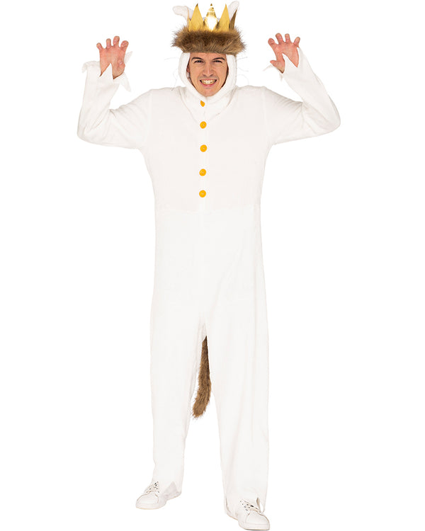 Let your imagination run wild this Book Week in our Wild Boy Deluxe Adults Plus Size Costume. This costume is inspired by the character Max from the illustrated book 'Where the Wild Things Are' and comes as a white full-length hooded jumpsuit with pointed ears and black whiskers attached to the hood. The jumpsuit also features down the chest of the jumpsuit four yellow button closures, as well as featuring jagged wrist and ankle cuffs. Finally, a plush brown tail is attached to the back of the jumpsuit and a gold crown with a matching fur base and ribbon tie closure at the back is included to complete this cuddly costume. A fun costume both you and your students will love during Book Week or any costume party.