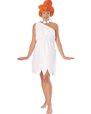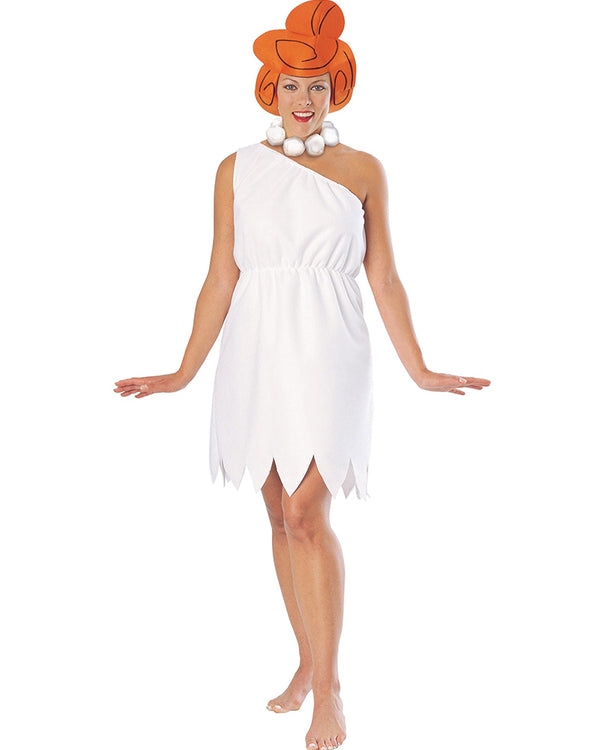 Look the like you've just stepped out of the stoneage in this Wilma Flintstone Womens Costume. The costume consists of a white one shouldered felt-like fabric dress with a tattered hem, a white plastic 'boulder' elasticated necklace and a cartoon felt headpiece with elastic to hold it in place and which is designed to frame your head only to get the 2D cartoon Wilma effect but does not cover the back of the head.