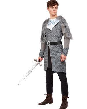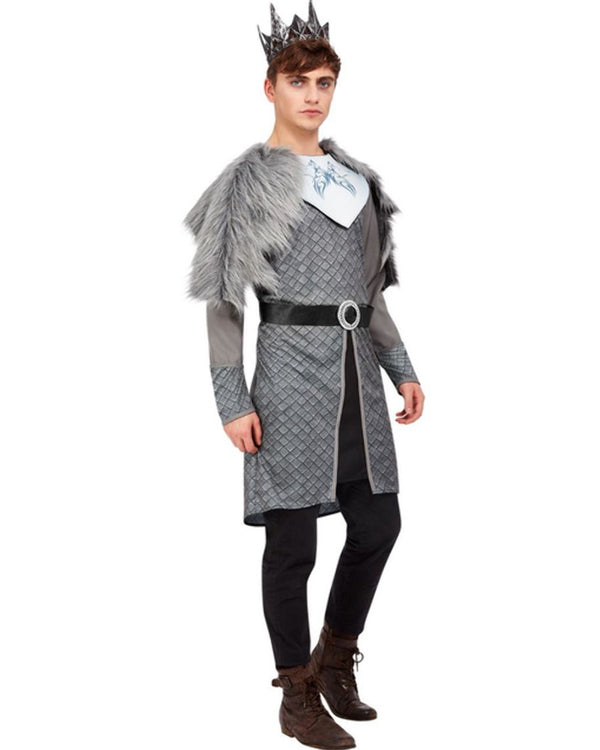 Protect your wintery lands wearing this Winter Warrior King Mens Costume. This costume included a grey armour printed long sleeve tunic with a white chest piece with an image of 2 blue wolves. The tunic also features an attached black belt with a silver faux buckle. There is an included pair of grey faux fur capelets.