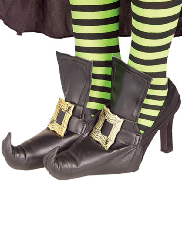 Add the perfect finishing touch to your costume with these Witch Shoe Covers. These black satin shoe covers feature a curled up toe with an oversized gold buckle on the front. The covers have a double elastic strap underneath to sit below the sole of your shoe keeping the covers in place.