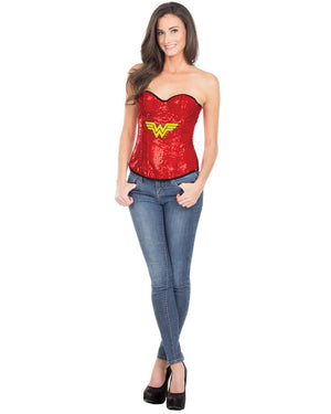 Wear this Wonder Woman Sequin Corset as part of a costume put together with the help of some of our fab accessories or just down the club with jeans. Dazzle them with the bright red sequined and boned corset with the iconic logo on the bodice. Wonderfully cool!