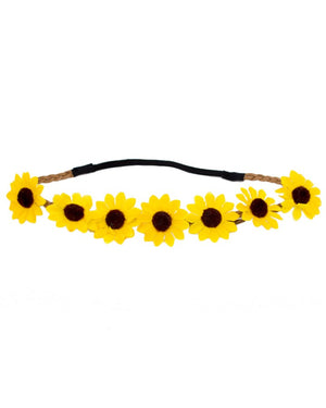 Wear this Yellow Daisy Chain Headband with a long wig and '60s style accessories. It's a rope style headband with elastic at the back and features 6 small fabric daisies.