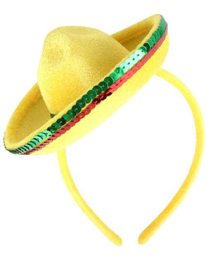 Pull out your Mexican flavours for your next Mexican party in this cute little Yellow Mexican Hat Headband. The red and green rows of sequins make for a great accessory!