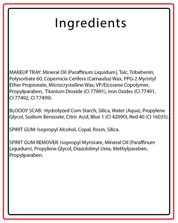 Ingredients: MAKEUP TRAY: Mineral Oil (Paraffinum Liquidum), Talc, Tribehenin, Polysorbate 60, Copernicia Cerifera (Carnauba) Wax, PPG-2 Myristyl Ether Propionate, Microcrystalline Wax, VP/Eicosene Copolymer, Propylparaben, Titanium Dioxide (CI 77891), Iron Oxides (CI 77491, CI 77492, CI 77499). BLOODY SCAB: Hydrolyzed Corn Starch, Silica, Water (Aqua), Propylene Glycol, Sodium Benzoate, Citric Acid, Blue 1 (CI 42090), Red 40 (CI 16035). SPIRIT GUM: Isopropyl Alcohol, Copal, Rosin, Silica. SPIRIT GUM REMOVER: Isopropyl Myristate, Mineral Oil (Paraffinum Liquidum), Propylene Glycol, Diazolidinyl Urea, Methylparaben, Propylparaben.